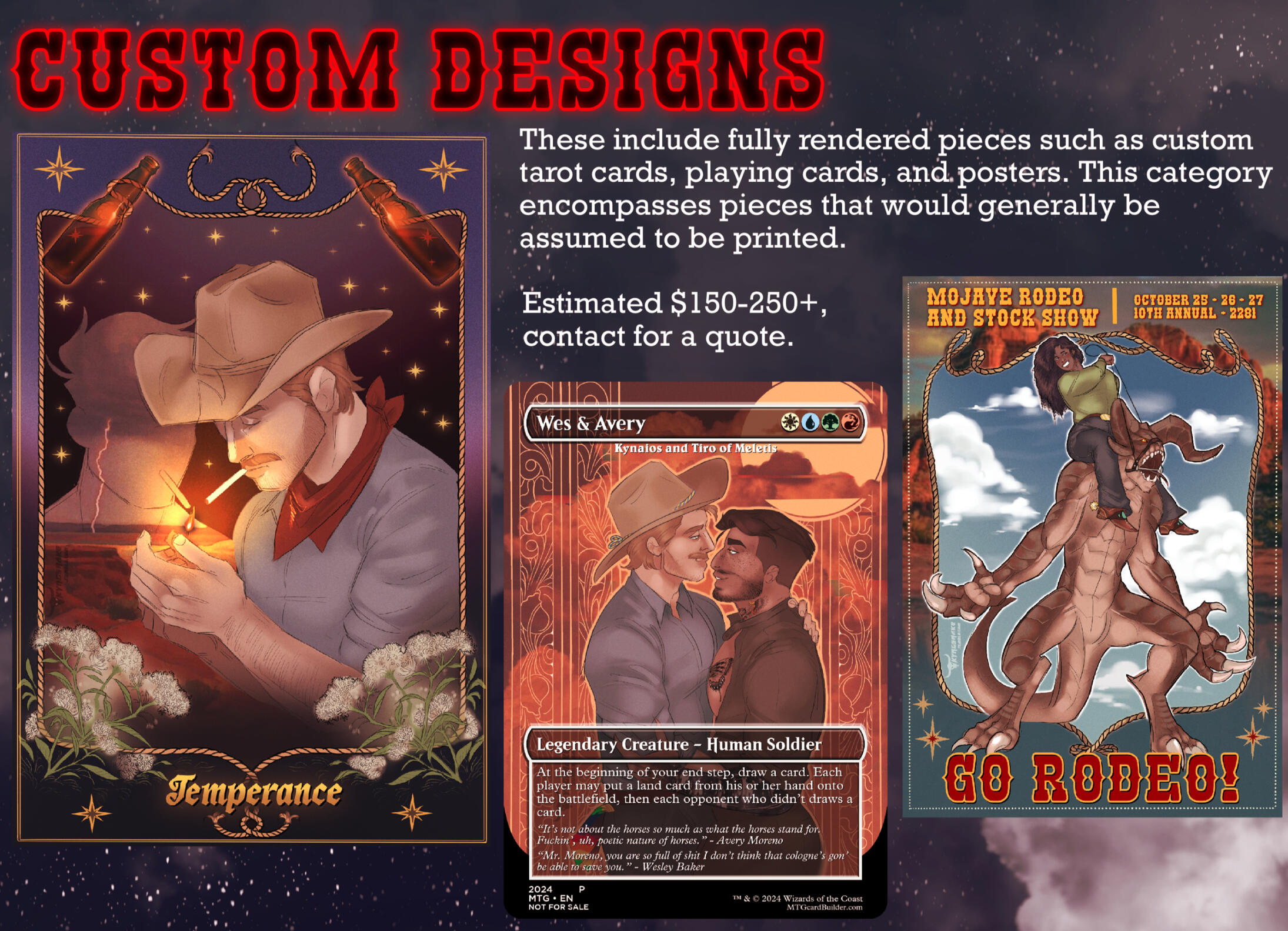 If you have an idea for a commissioned work that does not quite fit into any of the categories outlined above, just shoot me a message. I'm happy to discuss details and work out a price for you.I take payment for commissions upfront. Turnaround time is dependent upon the current queue size/size of the commissioned piece and will be relayed to you during your initial consultation. Turnaround times rarely exceed 2 months maximum and generally hover between 4-6 weeks. I provide updated with every stage of the process(sketch, lines, color, shading, final touches, etc.) unless you specify otherwise.